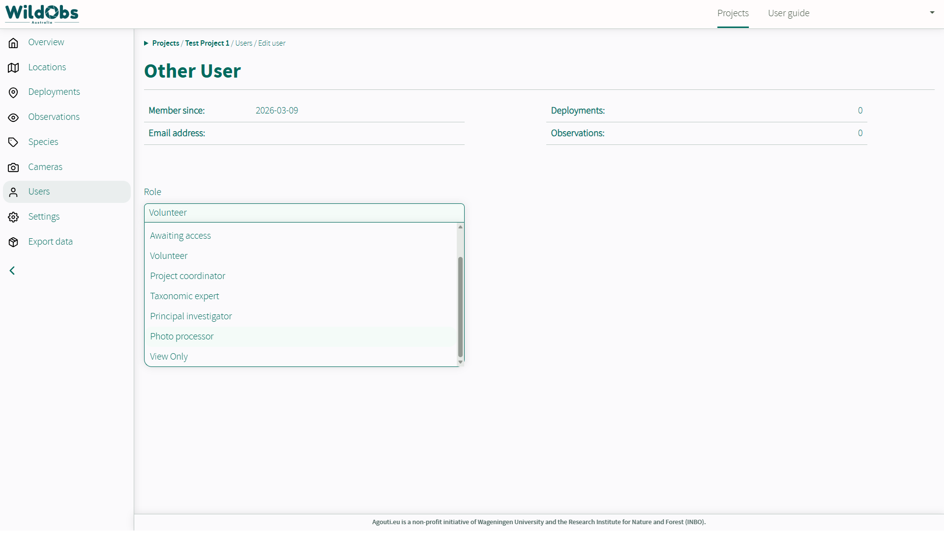 Only users with "Admin", "Principal investigator", "Project coordinator" or "Taxonomic expert" Roles on the project can view and manage users. For more information user roles and permissions, visit the Agouti documentation Roles and Permissions.